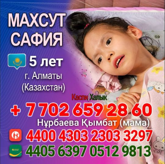 Дорогие казахстанцы, ради будущего моей дочери прошу вас поддержать нас. Каждое пожертвование приближает Сафию к жизни без боли, к возможности ходить, говорить и радоваться миру, как обычный ребёнок.